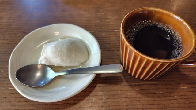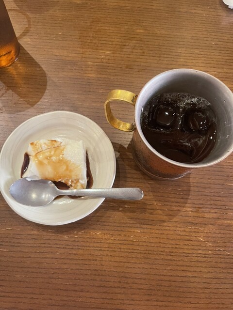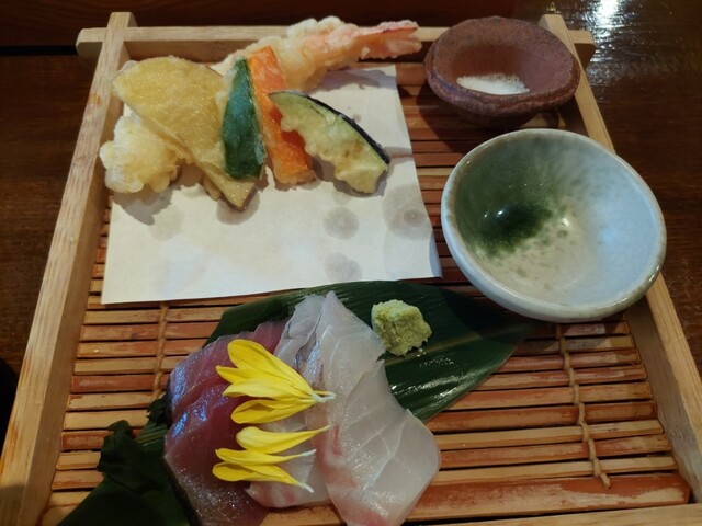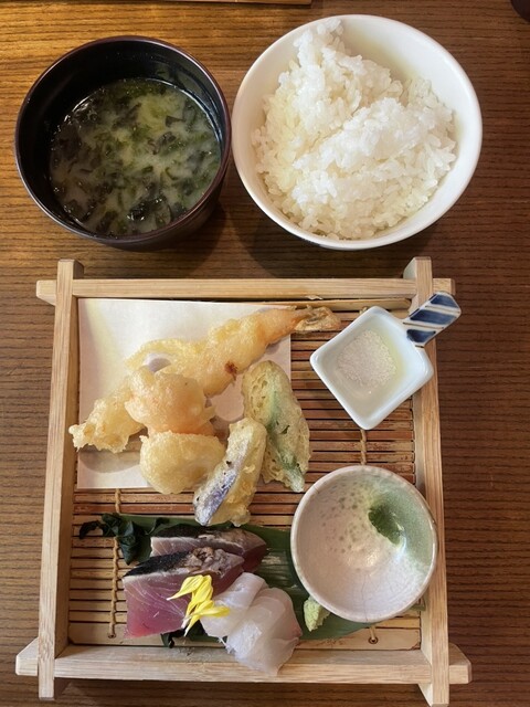 最初に小鉢がでてきます。そして、メインが。天ぷらとお刺身です。天ぷらがとてもサクサクしてご飯とよく合います。美味しかったのですが、全体的に量が少な目です。最後のアイスコーヒーは、年季の入った器に入れら...