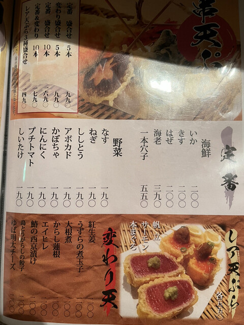 レア天ぷら 帆立 サーモン 本まぐろ 各550円