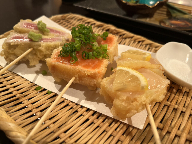 レア天ぷら 帆立、サーモン、本まぐろ