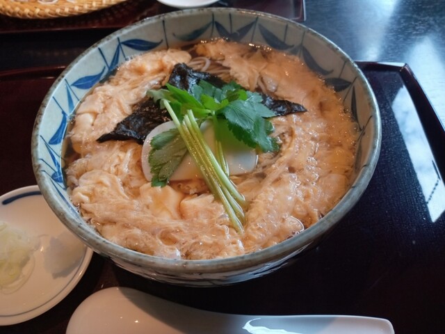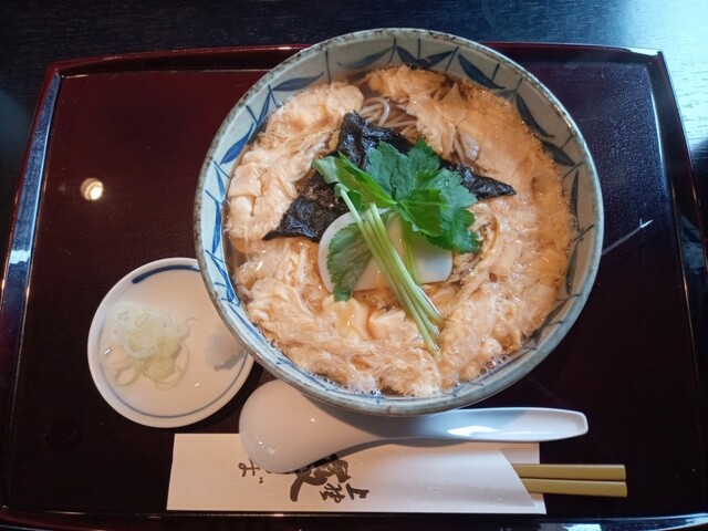 バランスのある汁とフワっと仕上がった玉子が見事な玉子とじそば。テキパキとした接客も良い。