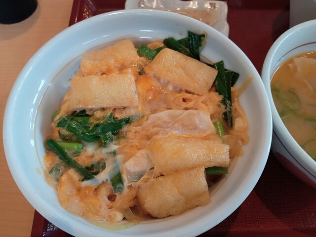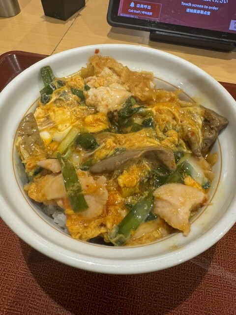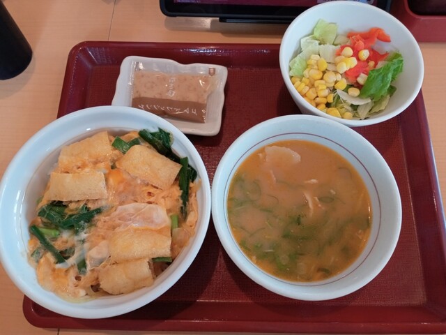 新商品のお揚げとにらの玉子丼は、お腹いっぱいになる優れもの!着席タブレットだと、ついついセット物を注文してしまう。