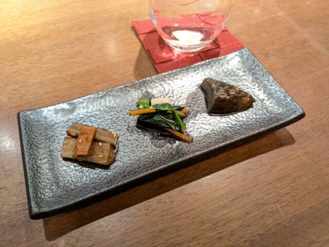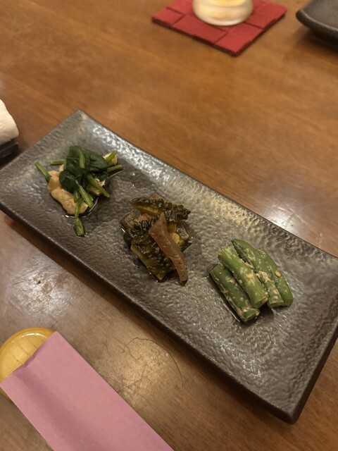 再訪です。 2ヵ月ぶりに伺いましたが、季節のオススメメニューは同じ内容でした。 他の方のレビューも拝見しましたが、こちらのお通しはお惣菜3種盛り合わせが定番みたいです。... 詳細を見る
