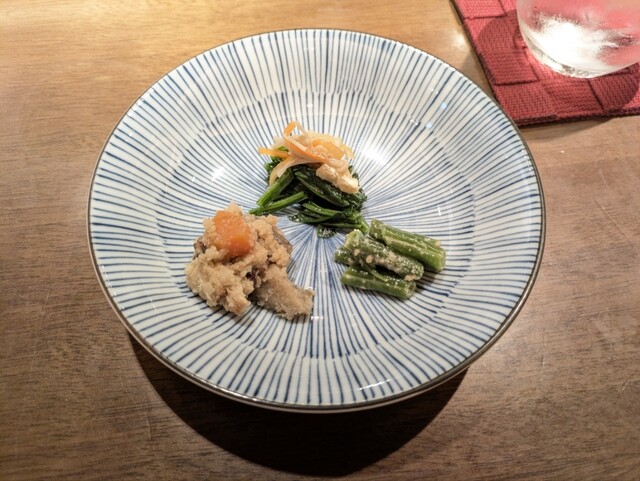 他の方のレビューも拝見しましたが、こちらのお通しはお惣菜3種盛り合わせが定番みたいです。