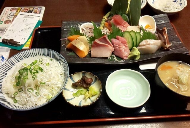 しばらく考えた後、連れは「日替わり・ぶりカマ焼きとミニ刺身定食:850円」と小鉢2個「しらすおろし:110円」と「ポテトサラダ:110円」。私は「刺身が旨い定食:1,320円」をしらすご飯で。どちらも「味噌汁→豚汁:110円」にして、ご飯は少なめでお願いしました。