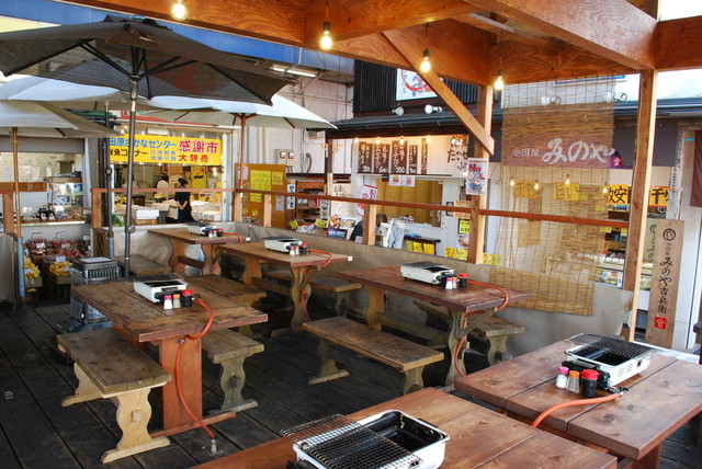 海の街、小田原に来たら美味し魚、野菜を食べてって!小田原魚センターでは、朝どれの魚介はもちろん、干物に蒲鉾、珍味、地場の野菜をたっぷろ用意しています。センター内の鮮魚店には生簀を用意、アワビにサザエ、ハマグリ、活きたまま新鮮な貝を専用浜焼きコンロでジュッ~!!野菜もジュ~ッ!!小田原漁港すぐソバ。1テーブル4人がけで席料90分、1,000円(税別)。