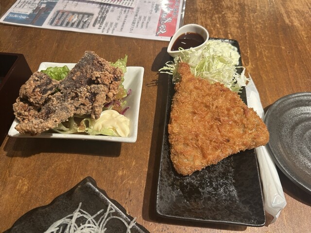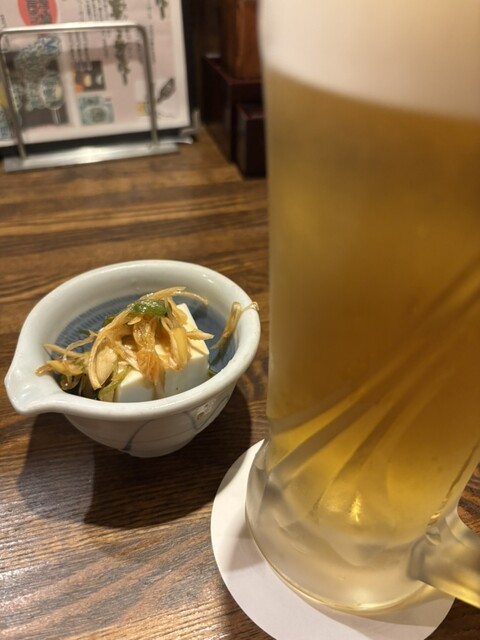連れと一緒に「アジフライ 2枚」462円と「揚げ物一家(海のフライ盛り合わせ)」1,518円をオーダーし「生ビール 中」352円で乾杯している...