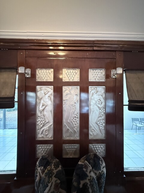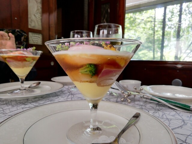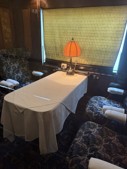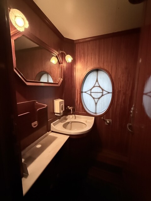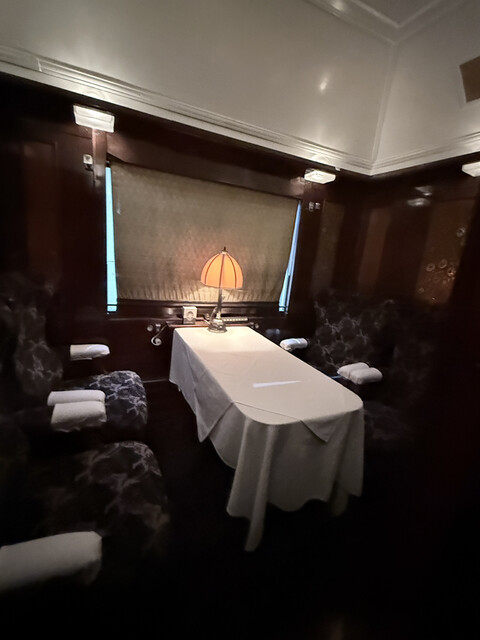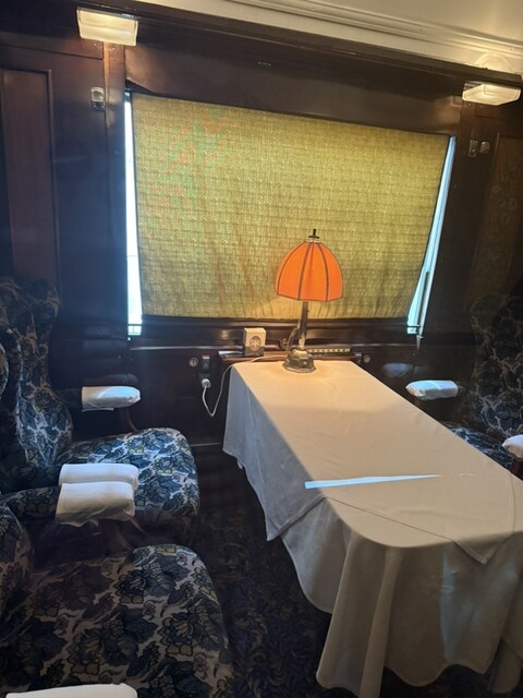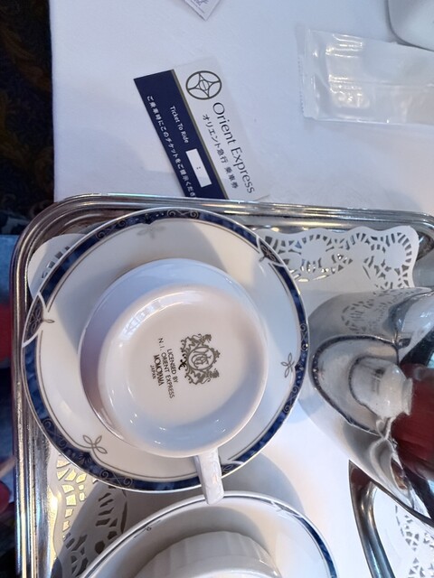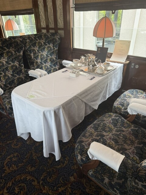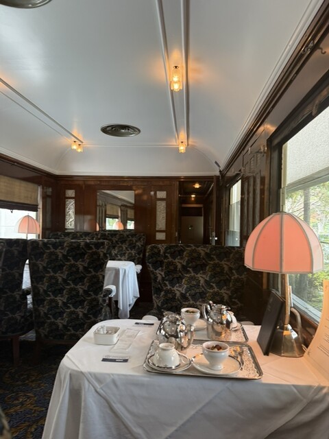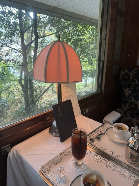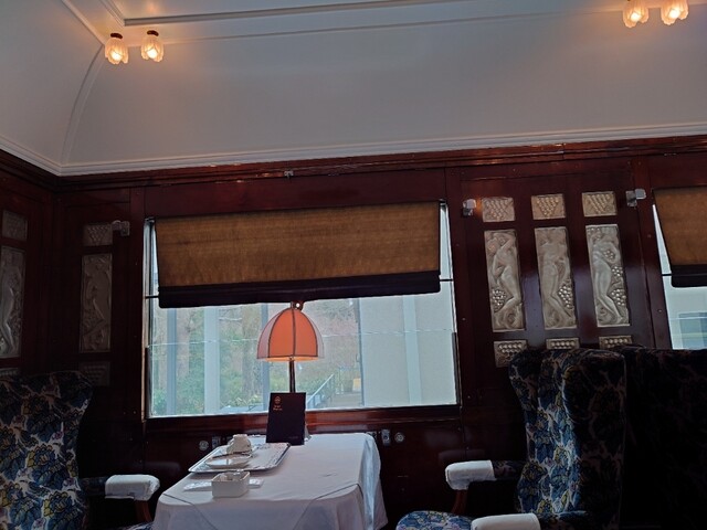 箱根ラリック美術館に併設された「オリエント急行」は、まるで時が止まったかのような特別な空間だった。実際にヨーロッパを走っていた豪華列車の車両がそのままティーサロンとして使われており、足を踏み入れた瞬間に非日常の世界へと誘われる。内装は繊細なラリックのガラス装飾が輝き、木の質感や真鍮の細工が歴史を語る。男性でも思わず見惚れてしまうほどの重厚感と品格がある。