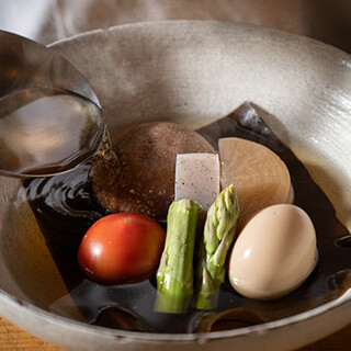 ...・鰹出汁フルーツトマト 胡麻のクリーム ・ふき 粉がつお ・ウドのきんぴら ・鴨のロース煮 ・出汁巻き玉子 ・そら豆の塩煮...今回は8000円をチョイス。 まずは椀物 うどのすりながし 薄味でグッド。寒い日だったのであったまりました。...アスパラの胡麻ダレがけ、 蕗と独活(うど)・たこの木の芽味噌和え...