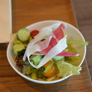 ...この日は、冷しかき揚げ蕎麦とネギトロ丼。 そして、リバークルーズで太陽の光を浴び過ぎたのでランチビール(300円)を一杯ずつ。 サラダランチは、サラダのトッピングとドレッシングを選ぶことができるようになっていて、妻はクリスピーベーコンのトッピングと、ノンオイルの人参ドレッシングをチョイス。 スープもついていて、見かけ以上にボリュームたっぷり。満腹になったとのこと。 日替わりのエアラインランチ、洋食にはサラダ・スープが付き、和食には小鉢とお新香が付きます。 この日の冷やしかき揚げ蕎麦とネギトロ丼...