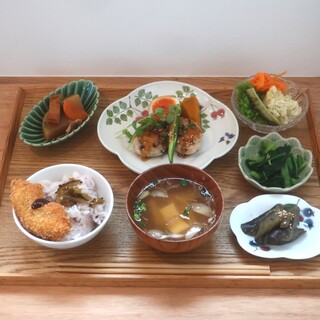 ...焼き鮭が塩味程よく脂がのり美味しい。 小鉢は、 ・ほうれん草と人参の白和え ・油揚げの鶏ひき肉巻き、さつま揚げと蓮根と 蒟蒻の煮物 ・蕪の浅漬け ・キノコのマリネ 丁寧に手作りの品でどれも美味しい♪ お味噌汁はえのき...