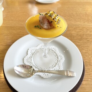 ...■信州の地元野菜 ■いちごとブラータチーズの一皿 ■焼きとうもろこしの冷製クリームポタージュ...最初にいただいたのはアミューズ。この日は"焼きトウモロコシのクリームスープ"でした。トウモロコシのスープは幾度となくいただいて来ましたが...
