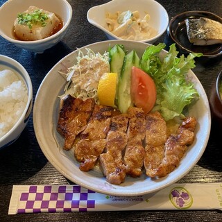 ...先客が2名おられましたが、ほぼ時間差なく唐揚げ定食の到着です。 メインの唐揚げ、一緒に盛られたサラダ、小鉢は、ホウレン草のおひたし、小振...