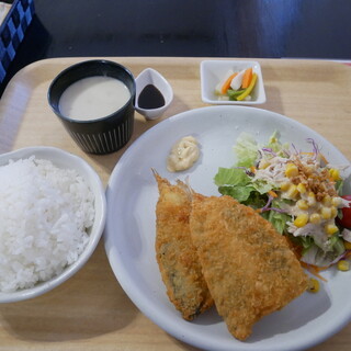...どうやらこちらの店主さんらしい。 やがて運ばれてきたアジフライ定食。 こじんまりとしているが一汁三菜、彩りも良くなんとアジフライが二尾鎮座☆ 小ぶりだが、旨い(((uдu*)ゥンゥン 由緒正しい日本のアジフライだ。w スープはコク深いポタージュ風、これにサラダと野菜のピクルス風の箸休め☆ 実に良い昼食である。 あらかたアジフライ定食つつき終わって。 うーん...ひっそりオープンしたお店。 カレー&ステーキのお店という事だが大好きなアジフライ定食があるとの事で凸! 流行りの古民家風だが...