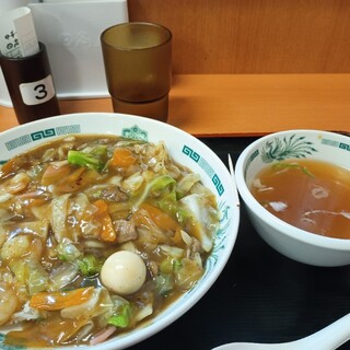 ...結構辛い。ずっと後引く辛さである。 前身?のガパオライス(バジルライス)を頂いていないので、なんとも言えないが… 麺の上にかかっているのは細かい鶏肉を炒めた、「餡」。パラパラに炒めた想像するガパオライスのそれとは異なり、片栗粉でトロミを持たせた、餡。確かに麺よく絡みます。 ガパオライスなら...