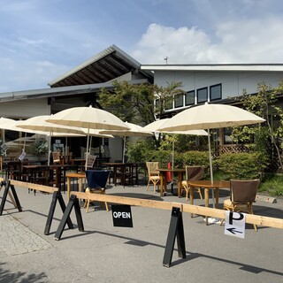 ...席は屋外のみでした。 テラスは雰囲気、緑が多く落ち着いて過ごせます、 パンはカルボナーラ(柚子胡椒入り)トースト、ハーブソーセージの挟まったサンド...