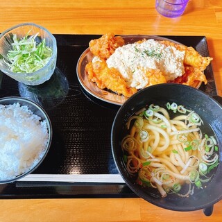 ...マルケン食堂さんにお邪魔しました 大衆食堂的な感じかな テイクアウトありーの リーマンに優しいお店 チキン南蛮定食にお汁をうどんにチェンジ うどんはそぼくに透き通るお出汁 うどんたけでも有りじゃねーかな? チキン南蛮のタルタルソースも既製感無くていいね ボリューム満点すぎな南蛮定食☆ チキン南蛮定食650円と小うどん(+100円で汁物から変更)をいただきました...