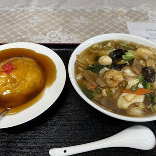 ...出て来てびっくりだったのがやはりそのボリューム。7〜800円台のメニューでかなりの盛り盛りです。...【天津飯】 甘酢餡がたっぷりかかっていてボリューム満点。 卓上のラー油とお酢で自分好みにカスタムして頂きました。 総合的に凄いボリューム感のある定食で...