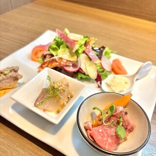 ...まずは前菜の盛り合わせとパン✧ 野菜と鳥テリーヌ、コンソメのジュレで。 イタリア産生ハムとメロン、ヨーグルトソース スモークサーモンのマリネ 野菜サラダ...