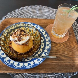 ...大きいプリン(JOULU TONTTOヨウルトントゥ監修)が。 アトリエ野恵さんのお皿でおっ!と思いました。 2人揃ってラムレーズンのプリン、ホットコーヒーを注文。 昨日よりの雨で気温も低く、小雨模様でかなり身体も冷えていたので、温かいコーヒーが見にしみました。 プリンの上には、生クリーム、キャラメルナッツ、ラム酒につけたレーズンが乗っていて...