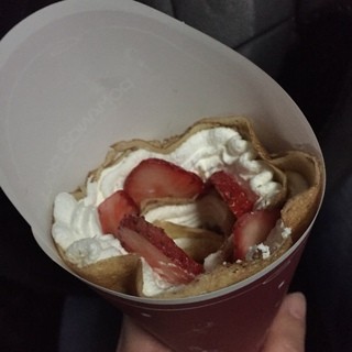 ...ケーキ?みたいな感じでした。 おいしいけど、クレープではなかったです。 値段が少し高いですが、割引の日などもあるみたいです。 生地を焼く...
