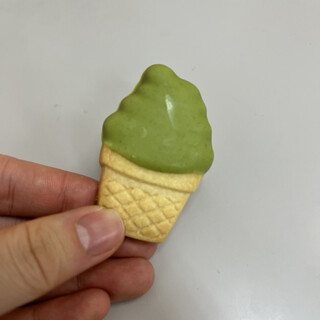 ...高校の購買にあったら争奪戦やろね。 グリーンソフトクッキー 抹茶ソフトクリームに最中で蓋して凍らせたグリーンソフトは大好物で、同じメーカーの飴は天王寺のよってってでも扱っていますがクッキー初めて見た! ソフトクリームの形のクッキーに抹茶チョコレートを掛けてあるけど、本物(ソフトクリーム)より抹茶感はずいぶん薄いな〜...