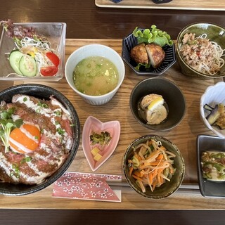 ...テイクアウト弁当も対応されているよう、山積みされています~! さー、来ましたよ♪色んなものがちょっとずつ。すごーい♡揚げたて天ぷら、肉団...