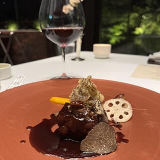 ...柔らかな肉質の佐久豚に、コクのある胡桃のソースに、 わさびがピリリときいていて、絶妙なハーモニーを奏でます 杏のスープ ルバーブのシャーベット添え 杏の自然な甘さのスープに、ルバーブのシャーベットなど、 今が旬のフルーツを満喫できるデザート、絶品でした ハーブティー 小菓子 杏とマンゴーのゼリー...