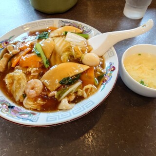 ...の向かいに有ります。平田町に牡丹園と言う所謂街の中華料理屋サン が有り、そこからの独立と耳にして覗いてみました。 注文したのは坦々麺セット(ご飯、漬物、生野菜サラダがデフォで、鳥のから揚げ3ヶか餃子5ヶのどちらかを選択) 1,110円也。 挽肉、ホウレン草、葱、ゴマの香りがする真っ当な坦々麺です。(中国では汁有りがないそうですが) 麺は心持細めで、ぽきぽきした食感です。 普通ー!としか言い様が有りません。 量的にスープも麺も、ご飯も餃子も普通です。 ちなみに、牡丹園の坦々麺は挽肉たっぷりと葱が餡になって麺を...