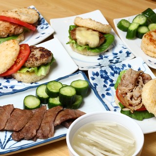 ...独創的すぎる ダブルバーガー 厚みのあるパテが2枚 漬物 バーガー1個にそれぞれつく スープ 生揚げ とうもろこしの味のするなにか 具の味付けはやや薄め 香ばしいご飯のライスバーガー 1個400円ほどなので...