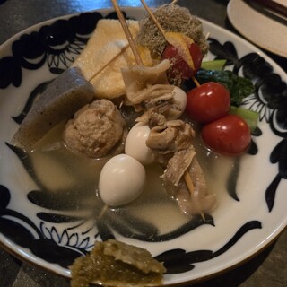 ...つけ汁は焼き鳥店ならではの材料の鶏の色んな部位から摂った濃厚 な出汁の利いた白湯です。そこに肉みそを入れて風味豊かに仕上げ ています。具がカモ肉?と竹の子でした。麺は恐らく業務用の物? かと思われますが、平たい太めの麺を使用しています。普通の麺量 は女性で丁度なので男性は大盛にしないと足らないでしょう。食前 に人参とトマトだったか?のジュースも出ました。有難いです。 *「そとくんの甘辛コメント!」 ・ランチのメニューの写真を撮ったつもりでしたが失念したらしいです。 他にはカレー風味のつけ麺や鶏白湯ラーメン・...