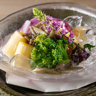 ...最初に供されたのはジュンサイ入りの鱧素麺であります。 鱧の香りと、素麺に練りこまれたことで食感は独特なイメージ。...■奇跡の肉 ■鶏炭火焼 ■お造り ■豆腐とツミレ ■ジュンサイ入り鱧素麺...