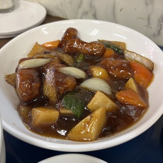 ...店内は一人でも食べやすい席から座敷まであり 雰囲気はレトロ漂う レイアウトのせいか少々手狭に感じる 酢豚定食(税別1,080円)を注文 酢豚とごはん、鶏の唐揚げ、杏仁豆腐、スープ、サラダがセットになっており、ボリュームは十分 コストパフォーマンスが高く、満腹になる ただ、酢豚の色味はやや薄めで...