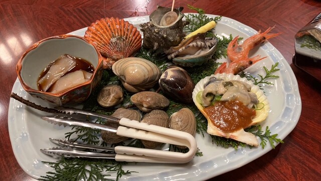 長太郎貝、サザエ、流れ子(トコブシ)など種類豊富な貝を中心に、海の幸が存分に味わえ、生きたままの貝を目の前で焼いて食べる豪快な海賊焼はジワジワ焼き上がる香ばしい磯の香りに思わずゴクリ。アサリのゆで汁で1時間かけて炊上げる「貝めし」の美味しさは格別で家族にと持ち帰る人も多いほどの人気。鰹のタタキや新鮮な刺身など魚料理も自慢。伊勢海老の活き造り、頭の吸物や味噌汁、雑炊もつくってくれる心づかいがまた粋。