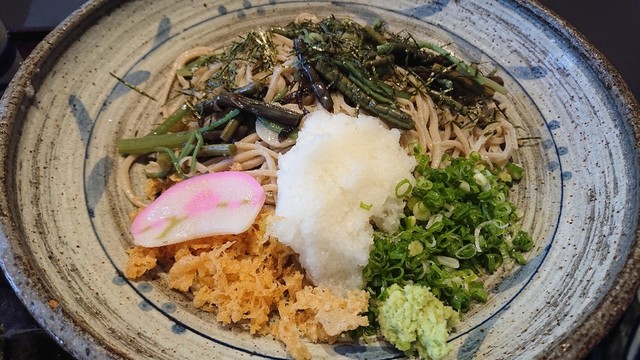 お昼前に訪問。お店はカウンターとテーブル席です。本日のランチ 伊吹おろしそば おにぎり付きをいただきました。伊吹おろしは山菜や大根おろしなどが入った冷たい山菜そばで、ぶっかけスタイルのそばで、コシのあるおそばで美味しくいただきました。