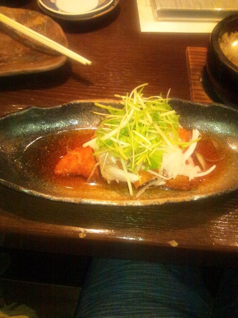 生ビールと付き出しが出てきた後で、注文したのが「石焼きひつまぶし」と「ササミフライ抽香酢」の二つ。どちらも、名前から来る珍しさと、美味しそうな感じに惹かれたのですが、大正解!!。