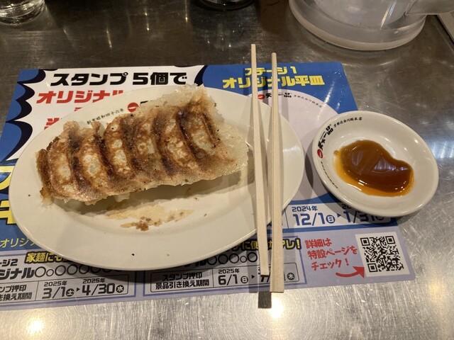 それはよしとして、【ニンニク増し増し】のお陰で①こってりで既に濃厚ですがより濃厚度アップ&ピリ辛加わって香り最高‼️②後日談、嫁より「翌々日まで匂う❗️」と誉め言葉?頂きました( ˊ̱˂˃ˋ̱ )餃子は言うに及ばず羽根つきで私感ですが、よく行く大◯◯◯の餃子を超えてきた⁉️