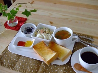 トーストセット(モーニングセット)は、スープもサラダも野菜がたっぷりです。特にスープは食べるスープなので、ボリュームもあります。 |