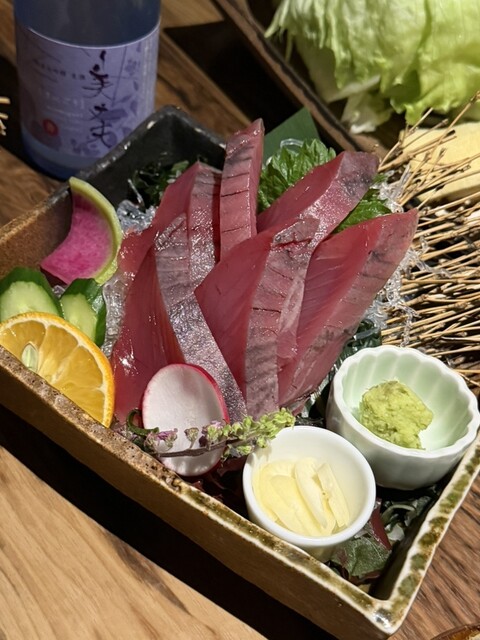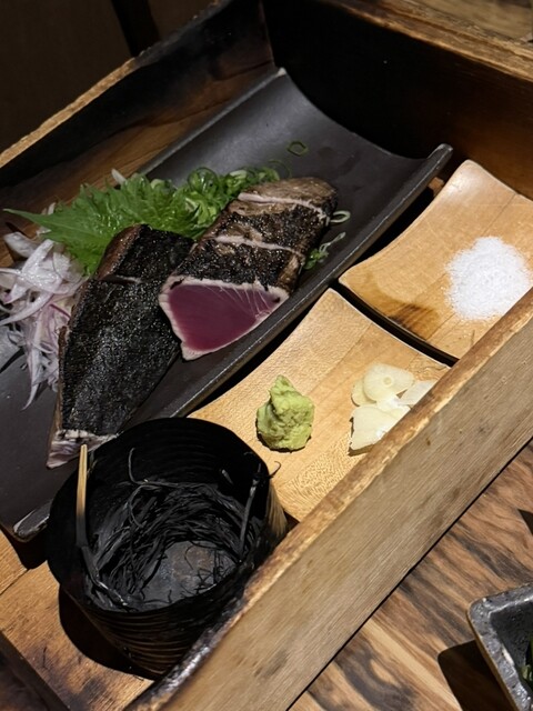 食べログ予約しての訪問。 18:00〜でしたが満席の張紙がありました。 店内は雰囲気良くオシャレ。 半個室のテーブル席に案内されました。 お通しのカツオチーズ。 カツオの藁焼きは生と藁焼きの良いところ取り。 薬味もありポン酢でも食べましたが 塩で食べるのが一番美味しかったです。... 詳細を見る