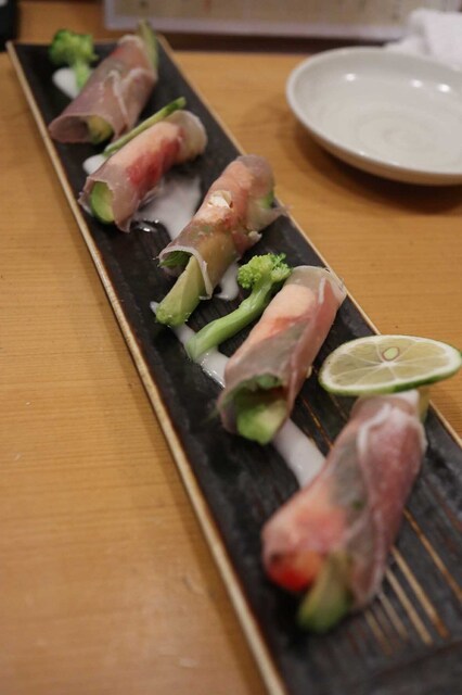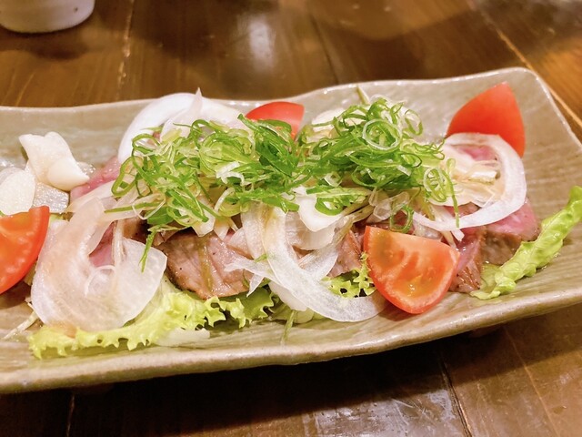 料理は「あか牛と花にらのしょうゆ漬けユッケ」でスタート。…高知の野菜として有名な「花にら」がシャキシャキ食感で美味しい。阿蘇と並んで有名...