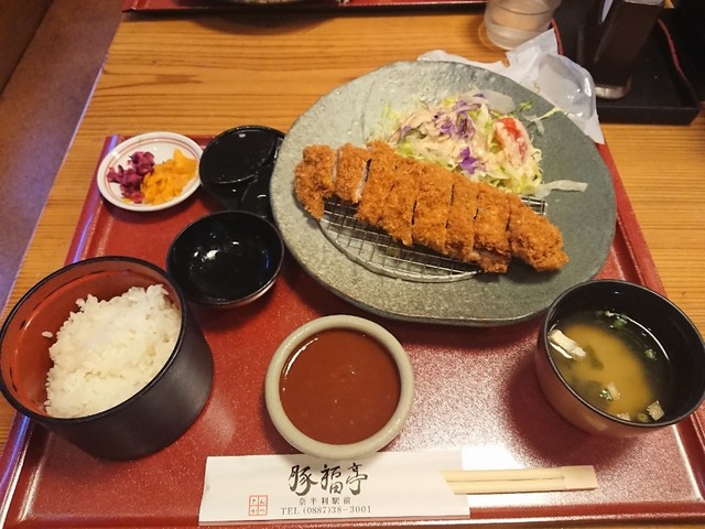 とんかつ屋さんですが、おおきなエビフライが売りなようです。通常のとんかつ定食以外に「ゆず豚」ロースというのがあったで