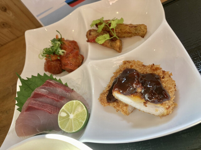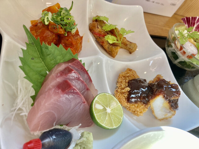 夕食で訪問しました。 地元の魚から焼肉や唐揚げなど、豊富なメニューに悩みますがここはやはり魚介を選択。 かつおたたきと天ぷら定食をオーダーします。 到着した定食は、たたきも天... 詳細を見る