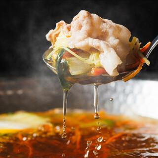 엄선된 미야코섬 No.1 아구 돼지를 사용한 궁극의 전골|고집스럽게 선택한 2종 특제 육수와 함께.