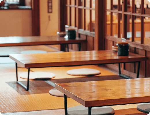 일본에서는 보통 직원이 좌석으로 안내하므로 임의로 앉지 않습니다. 서양식 테이블석 외에 다다미가 깔린 '좌식(座敷)'이 있을 수 있으며, 이용 시에는 다다미에 오르기 전에 신발을 벗어야 합니다.