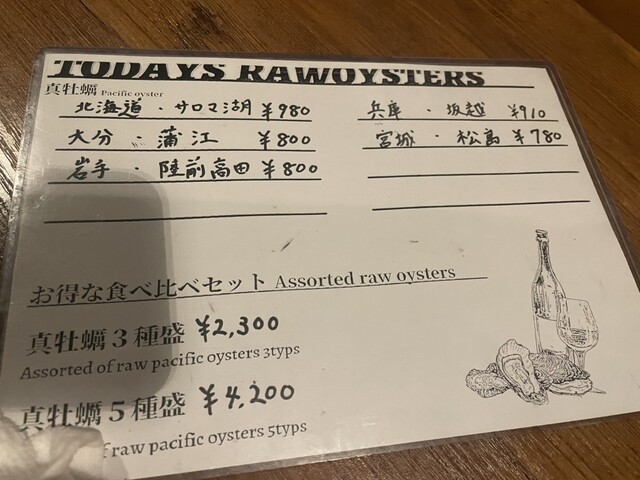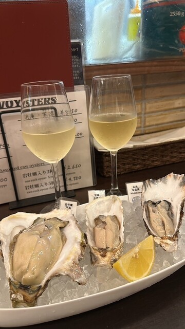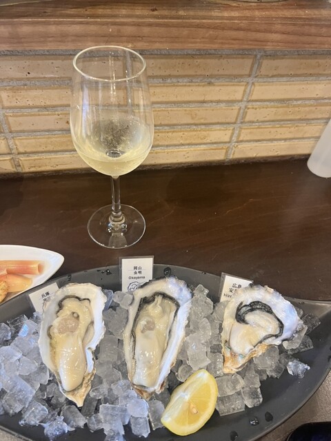 지난 겨울에 방문했었는데 이번에는 8월 말에 방문했습니다. 두 번째 장소였기 때문에 화이트 와인 한 잔씩과 굴 3종 세트를 주문했습니다. 굴은 도쿠시마산 암굴, 미야기산과 히로시마...