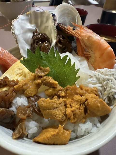 바다를 바라보는 펄로드에 위치한 해산물 전문 식당입니다. 어업 협동조합 회원인 주인이 직접 양식한 굴을 비롯해, 지역의 해녀와 어부들로부터 구매한 신선한 해산물을 제공합니다. 대표 메뉴인 해산물 덮밥은 25종 이상으로, 특히 "아침 해산물 덮밥"은 아침에 잡은 해산물에 새우, 조개, 오징어 등 10종 이상의 해산물이 가득 담겨 있습니다! 그 외에도 이세에비..., 전복, 소라, 명물인 우라무라 굴과 마키야 굴의 바다 구이 등, 연중 내내 다양한 해산물을 마음껏 즐길 수 있습니다!