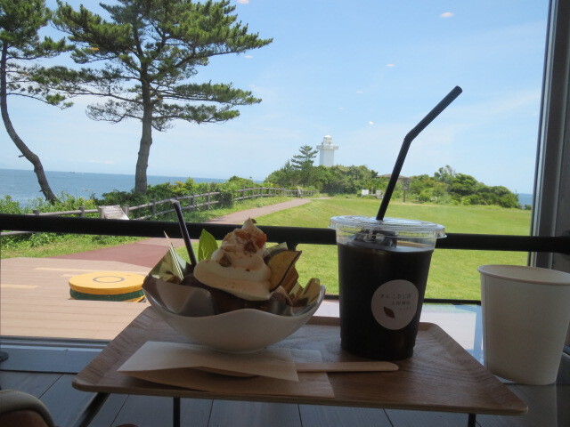 짙은 파란 바다와 하늘이 펼쳐진 미에현 시마시, 안로사키. 그 곶 근처에 위치한 하얀 등대 옆에, "긴코 고구마 공방 우에다 상점 등대 카페"가 있습니다. 지역 ...자세히 보기