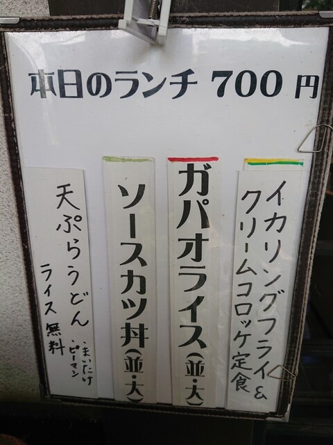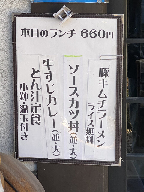 오랜만의 방문. 입구에 오늘의 점심 특선 메뉴에 소스 가츠동이 있어서 망설임 없이 결정했습니다. 보통은 850엔인데 660엔이라서 꽤 저렴합니다. 게다가 대접도 무료입니다.