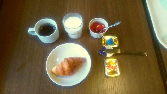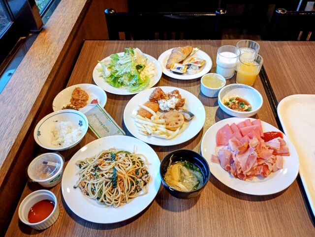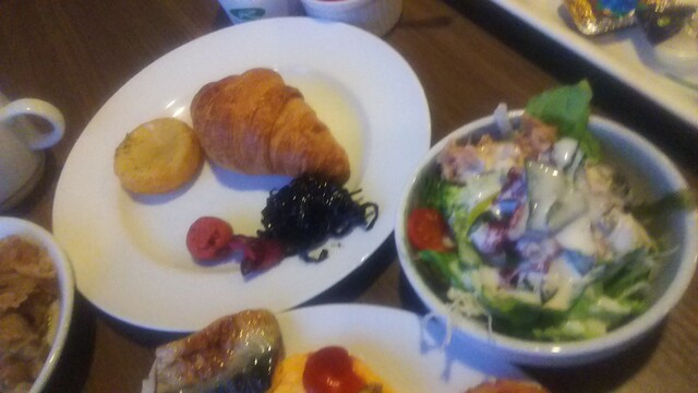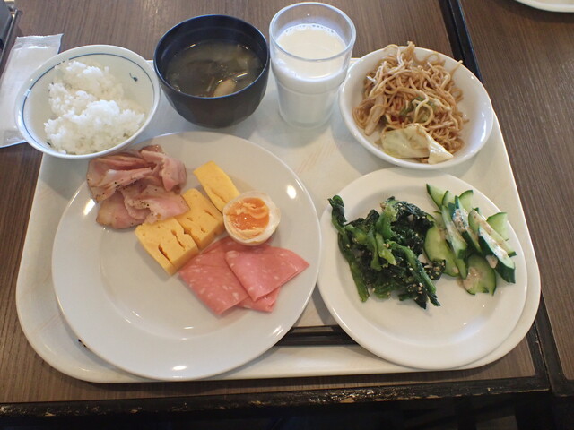 無料朝食を頂きました。玉子焼き、ハム、ベーコン、ゆで卵、野菜、ご飯等を頂きま...