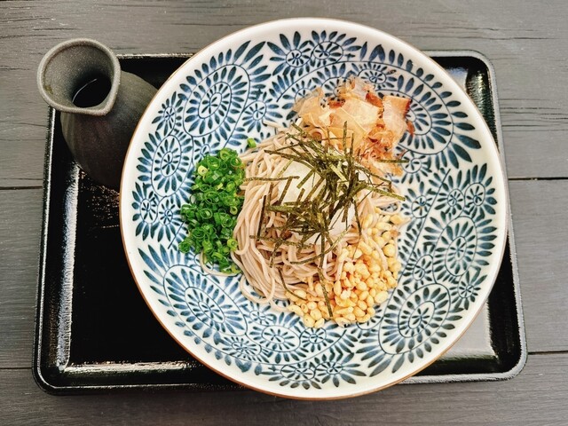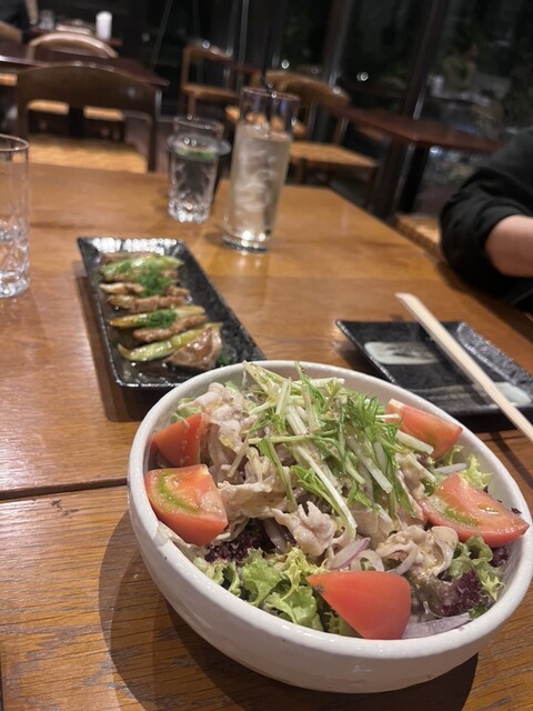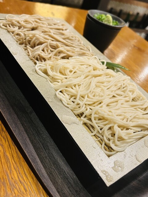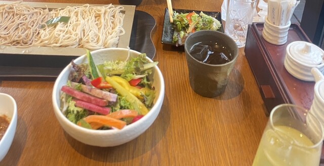 두 가지 색의 메밀 소바를 메인으로 하여, 돼지 샤브샤브 샐러드와 오리와 파 볶음, 치킨 타츠타아게 같은 것을 주문했습니다.