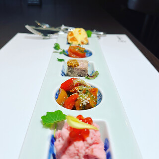 ・아뮤즈 오늘의 가벼운 아뮤즈 ・오드블르 전채 5종 모듬 포테이토 샐러드 라따뚜이 신슈 연어와 오렌지 마리네이드 파테 도 캉파뉴 캐롯 라페 ・수프 여름철 차가운 수프 겨울철 따뜻한 포타주 ・생선 요리 참돔 바푸르, 색색의 야채와 아메리케인 소스 ・고기 요리 치바현산 야치요 비프 램프, 샤리아핀 소스 까지입니다. 디저트와 식후 음료는 별도입니다. |